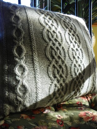 Sport weight yarn, size # 3 needles and a great combination of cable stitches makes for a 17" pillow that just pops with solid dimensional texture and pattern on both sides. 3, 4, and 6 stitch cables comprise the bulk of the stitching, along with a 3-stitch plait/braid. Directions on how to knit these stitches are included under the Abbreviations and Stitch directions. All are easy and only require a cable needle. Blocking is a must to achieve a nicely squared 17" pillow. Blocking wires are the only way to go, pinning just can't get the same result.