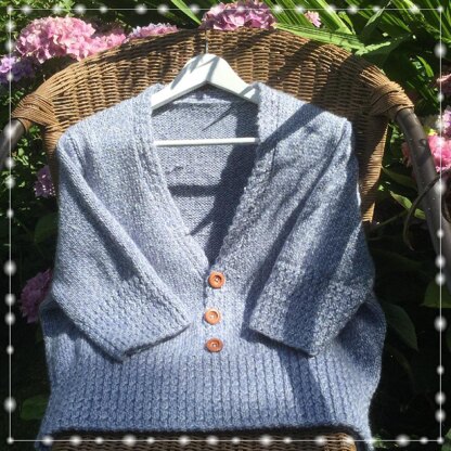 Loose fitting casual summer sweater, just the right weight and feel to pop on on cool summer nights. Has a deep welt in a twisted rib, that matches with the deep cuffs of the 3/4 elbow length sleeves. The sleeves are fitted and the front of the sweater is finished with a simple but effective 3 buttons ‘V’ neck feature. The pattern comes in 5 sizes and is knitted on 4 and 5 mm (US 6 and 8), so fine enough to show the detail but your knitting grows quite quickly. Please note on line stores add VAT onto my prices. I am not VAT registered so if you buy through my web site you don't pay VAT.