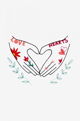 Love is in the air with this free downloadable embroidery pattern. Use DMC threads to stitch this illustrative design featuring two hands, decorated in bright florals, romantic motifs, and the words ‘love’ ‘hearts’.
