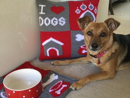 Here is a set of 4 intarsia charts with instructions on how to knit them into a dog lover's cushion and matching pet bowl mat.