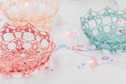 A delicate doily basket in romantic pastel shades to display jewellery or trinkets. Based on the intricate antique doilies of old, this updated version can be used as a decorative bowl. Choose bright or even neon shades for a really modern look.