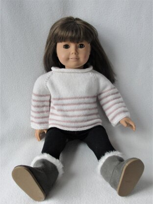Adorable raglan yoke pullover sweater pattern for Bitty Baby, American Girl or 18 inch dolls. Striped color work on lower portion of body and sleeves. Familiar stitches are used, and can be completed in a few evenings for your favorite little girl to play with!
