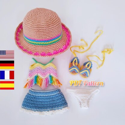 Doll clothes crochet pattern, summer outfit for Astrid, Amigurumi doll outfits in English, Deutsch, Français, Spanish /Español