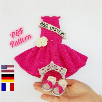 Doll clothes crochet patterns, Amigurumi doll outfit Miss Universe for Astrid 30 cm (11,8 inch) (English, Deutsch, Français)