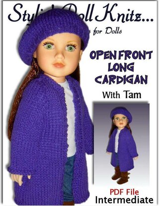 Open front long Cardigan and slouchy hat pattern, fits 18 inch and American Girl dolls (including Journey Girls and Maplelea Girls). PDF File.