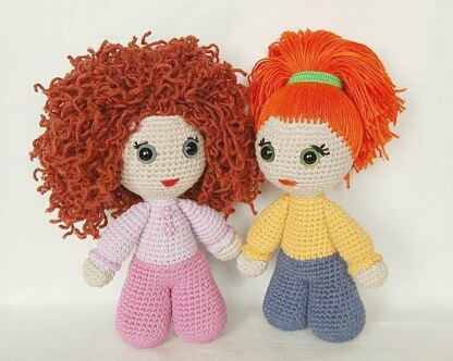 For the doll: Drops Cotton Light (50% Cotton, 50% Polyester; 50 g = 105 m) For hair: Four Seasons Gründl Milena (100% Merino superfine; 50 g = 125 m, brown) or Baytree Bamboo (70% Bamboo, 30% Cotton; 50 g = 210 m, orange)