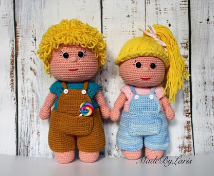 With this pattern it is possible to make the girl (Jill) and the boy (James). Total height of this finished product is +/- 25 centimetre.