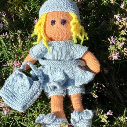 Fleur the garden doll loves to play hide and seek amongst the bushes anf flowers in the garden. Knitted flat the pattern includes instructions for the doll, her knitted blue outfit, skirt, top, knickers, shoes,hat and bag. The doll is knitted in 4 ply yarn and the clothes 4ply cotton. Works well with paintbox yarns.