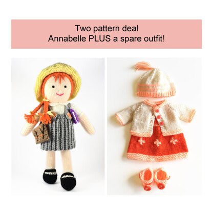 Meet Annabelle! She's all ready for school with her school bag and school book. Plus in this very special two pattern deal Annabelle also comes with a lovely spare outfit of a dress, jacket, beanie hat and shoes. She stands around 33cm (13 inches) tall and comes complete with her school dress, hat, school bag, school book plus the spare outfit. The patterns are knit flat and seamed and are very easy to follow with clear instructions and photos.