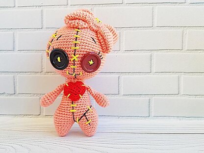 This pattern has 27 pages and with a great amount of step-by-step photos, a list of necessary materials, contains detailed description of crochet Doll Little Voodoo Girl. Materials needed to create a 6,3 inch (16 cm) tall doll: ● Main color yarn - pink, Beatriz (For sure you will have another brand that is available in your country), acrylic 100 g +/- 350 m (3.5 oz +/- 381 yard), (Size 5 bulky weight yarn) ● Yarn for the decoration and heart – red, black and yellow, cotton 100 g +/- 415 m (3.5 oz +/- 454 yard) ● Crochet hooks: 1.5 mm, 2.25 mm, 2.75 mm (or any other in accordance with the yarn you use). ● Soft stuffing (like White felt, Fiberfill for stuffing, etc) ● Buttons for eyes: Ø 1.0 inch (2.5 cm) - 2 pcs. ● Tapestry needle, Scissors