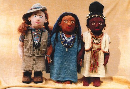 Three dolls in various outfits. Dolls follow the same pattern so skin and hair can be changed. Clothes are removable.