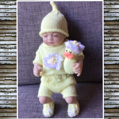 Daniel loves wearing his daisy duck outfit and especially taking his toy duck to bed with him to cuddle. The outfit is knitted flat in 4ply and the pattern includes a jumper, hat, knickers, shoes and a toy duck as well as the pattern for the daisies. This pattern works well with Paintbox yarns.