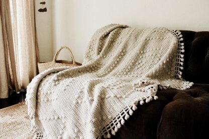 Cover yourself with diamonds upon diamonds of squishy bobbles with the Domino Coverlet. The square shape fits perfectly atop a bed or couch and the pompom edging adds even more drama.