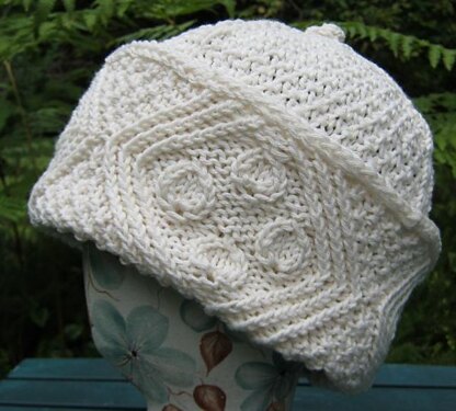 Moss stitch diamonds alternate with diamonds containing “bells” – essentially large, flattened bobbles, on the cuff of this warm winter hat. The body of the hat is also worked in moss stitch, beginning from the top.