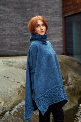 Round knot cables adorn the bottom and the top of this poncho. A high collar gives it a noble look, hence the name Donia; Celtic for rules all. The upper part is picked up and knitted from the lower cable panel and worked in stockinette stitch with shaping for the shoulders. The short sleeves in rib hold the poncho together. You can wear it with a belt or a shawl pin to gather it at the front or loose, just as you prefer.