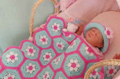 The Doris Daisy Hexagon blanket is such a pretty one! This blanket has been crocheted using an DK / Light worsted weight 100% cotton yarn. Each hexagon starts with a cute flower! The Hexagons are sewn together through the back loops giving a lovely flat finish, ready for the neat and simple single crochet border.