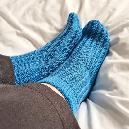 Techniques used : Socks are knit cuff down Folded stockinette cuff All over mistake rib pattern using knit and purl sts German short row heel Rounded toe with simple decreases while maintaining pattern Grafting Pattern includes charted and written instructions
