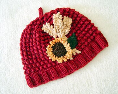 Knit in the round in a simple textured pattern, this hat will knit up in no time. The sunflower, leaf, and shaft of wheat are knit separately and sewn on.