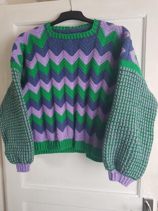 Inspired by 90's patterns, the Dory Sweater incorporates the chevron stitch for some strikingly bold zig zag's as it's main body with contrasting linen stitch sleeves for a clash of pattern and texture. Ideal for stash busting.