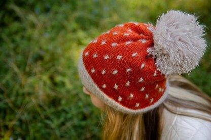 The hat is worked from the bottom up and also utilizes two very different fibers, adding yet another dimension of contrast. Detailed instructions are included for making pom pom, if desired. Hat is shown in size Child on my smallish head with approximately 2.5” negative ease; recommended ease is 2-3”/5-7.5 cm smaller than actual head circumference and general age labels are provided from preemie to giant noggin. Pattern is written for knitters ready to tackle a higher level of stranded colorwork; stitch pattern is both written and charted. Be sure to view the entire Dottie Collection. Hat is shown with Rosewood Pullover (pattern sold separately).