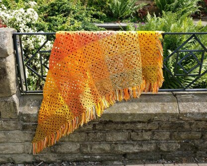 This shawl is made from simple granny squares. It is the combination of yarns that create the subtle shading effect.