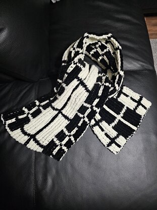 Double knitted Scarf is about 12 inch wide, the lenght of the scarf is up to you. Scarf is made with circular needle US 10 (32") Yarn is super bulky, and takes about 4 ball of yarn, 2 each color. Pattern is knitted about 11 times.