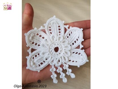 Double layer flower with tassels crochet. Modern crochet Irish lace pattern . A detailed pattern for all crochet motifs - a graphic diagram, a photo and a verbal description of each crochet row. PDF file for 13 pages Design work by Starostina Olga.