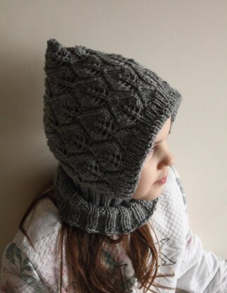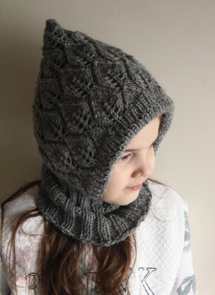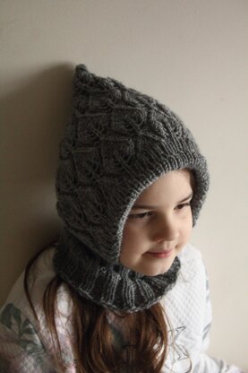 Do you love the look of knit leaf lace? But then you also want the knit hat to be a warm one… Enter the double leaf lace pixie balaclava! It is lined – knit in two layers – and it is extra warm because of that! This is the perfect comfination for winter, a hat and a scarf, two in one. It stays put and keeps the ears covered and the neck warm. The pattern comes in many sizes: from newborn to teen size.