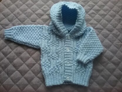 Baby hoodie, suitable for boy or girl, worked in one piece to the armhole. One size only 0-3 months.