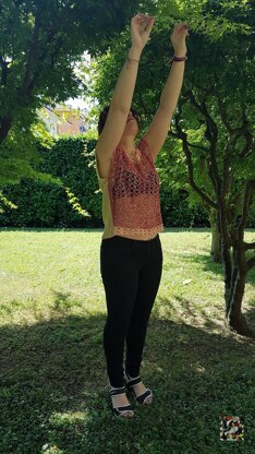 It's a double-face summery top, casual style with a hint of elegance to it. It's delicate colors countertop the lacy structure making for a very fresh garment. Moreover, it's two garments in one, as it can be worn either side facing, according to your mood.