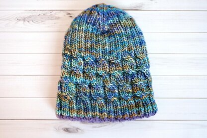The pictured hat used a provisional cast on, which was then used to knit an inner hat. Instructions are included to create a similar double layered hat.