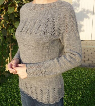 Dove is a seamless, bottom-up round-yoke sweater with a delicate lace pattern.