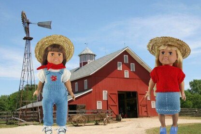 Cute wearables even for "city kids"! Pattern includes bib overalls, tee shirt, red bandana, A-line denim skirt. Easy patterns, uses sport weight yarns, baby weight yarns, knitting needles, US #5 and #6. The perfect outdoor outfits to round out any wardrobe, and to wear when visiting Grandma and Grandpa on the farm! Straw hat can be purchased at hobby and craft stores.