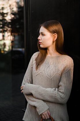 "DRAGOBRAT” sweater is worked from the neck down completely seamless. The circular yoke features a cable pattern that seamlessly transitions into the stockinette stitch or ribbing in which the body of the sweater is worked. Increases at the sides create the A-line shape of the garment.