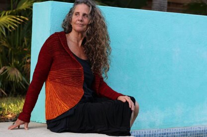 This cardigan takes full advantage of the beautiful gradient yarns currently being produced by hand dyers. Worked from the center of the back out the zigzag stitch pattern allows the colors to blend together. The front uses short rows to turn the corner, creating a wonderful curved front and works in garter up to the folding collar. Top down set-in short row sleeves finish the cardigan. While perfect for a gradient yarn this would work equally well in a variegated or semi-solid yarn.