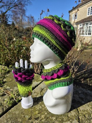 A useful ear warmer / cowl with the classic crocodile stitch to give it texture and a look of dragon scales. This matches beautifully with my hat and gloves patterns.