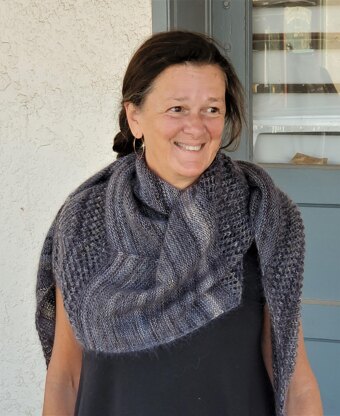 This interesting asymmetric shape shawl is sometimes referred to as a kite shape. It has a noticeable line, or “spine” from tip to tip. As you are increasing at the beginning the shawl, the spine is in the center. After the shawl reaches the desired number of stitches, the spine shifts one stitch to the left on every RS row until the end tip. Tiramisu, a beautiful self striping yarn with a soft halo really shines through the simple stitches and fun shape. Wear it cozy - wrapped around the neck, with a leather cuff or simply drape over the shoulders for light weight warmth.