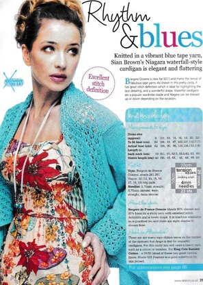 This is a pattern for a Draped Lace Edge Cardigan, originally published in Lets Knit. It is a simple shape in stocking stitch with a simple lace edge. It is knitted in one main piece form side to side, with cast off and on for the armholes and the sleeves knitted separately. The yarn has now been discontinued (it is a tape yarn). Any yarn knitting to the tension 23 sts x 29 rows over 10 x 10 cm can be used. As the shape is not fitted the yarn used and tension is not critical. Photos Lets Knit.