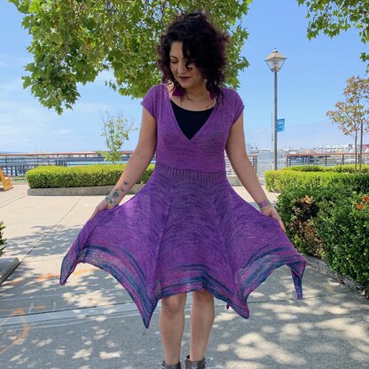 Inspired by nature’s original knitted creation, the spiderweb, Dream Weaver is a figure-flattering faux wrap style dress with a paneled skirt. Designed to be knit in a sport weight cotton/linen yarn, perfect for warmer weather.