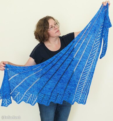 The semi-triangular, bias knit shawl starts with a section of lace pattern, then 8 garter stitch wedges, separated by rows of double yarn-overs, are added one by one. Each garter stitch wedge widens gradually and ends with 2 repeats of the lace pattern.