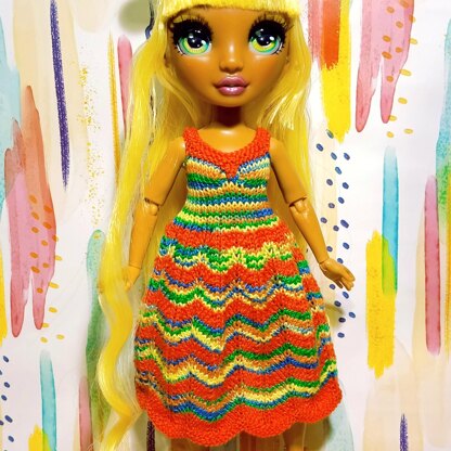 Pattern contains instructions how to knit beautiful summer dress for your Rainbow High dolls.