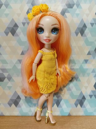 Pattern contains instructions how to knit beautiful summer dress for your Rainbow High dolls.