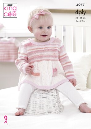 Dress, Sweater & Cardigan in King Cole Big Value Baby 4Ply - 4977 - Downloadable PDF is a Intermediate Knitting pattern by King Cole, available as a Downloadable PDF and includes instructions in English. Super fun to make, this pattern could be your next masterpiece!