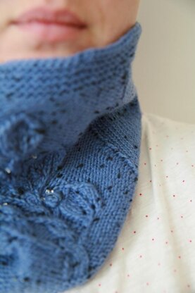 This cowl features a twisting cabled centre column that has leaves branching off to each side. It is richly textured and I have embellished the tweedy yarn with 12 tiny glass beads over each nupp to add a sense of something delicate in the midst of all the cabling.