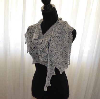 This lovely, lacy, versatile shawl conjurs up visions of sparkly little raindrops and the dramatic grey of a stormy sky. It's knitted from Miss Bab's wonderful "Keira". This is a heavy fingering weight with bounce and saturated color.