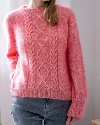 Cozy raglan sleeved sweater with beautiful cables on front. The sweater is worked seamlessly from top down and requires minimal finishing. The work begins with the neck ribbing, followed by the raglan increases. Some short row shaping is worked at the bottom of the raglan section to lower the mid front. When the raglan increases are completed, sleeve stitches are placed on hold. The body is then worked in the round towards the hem. Sleeve stitches are then placed back on the needles and the sleeves are worked in the round towards the cuffs. The pattern includes photo tutorials for German short rows and tubular bind-off. The cable pattern is charted.