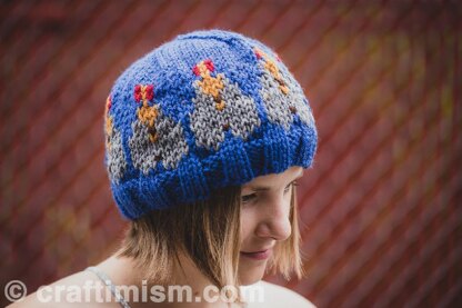 The finished hat is ~19” unstretched, stretches to ~24” and measures ~7” from the brim to the top. The hat can be made larger or smaller by adding or subtracting fruit fly repeats.
