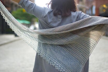 Duane Park Triangle is an elegant two-color asymmetrical triangular shawl beginning with only a few stitches and increasing from one point to a broad lace border that embellishes one edge. Each right side row increases the overall stitch count by two stitches. Each wrong side row decreases the overall stitch count by one stitch, leaving a net increase of one stitch over two rows.