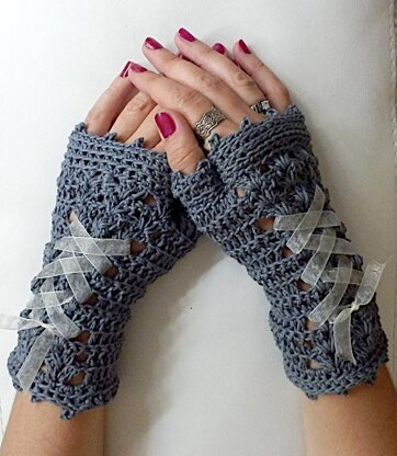 GENERAL INFORMATION These fingerless gloves are a part of the set with the “Duchess” Shawl. The pattern consists of double crochet stitches, and the central motif is one of the lacy patterns from the shawl. Upper and lower edges are done with single crochet stitches and the last round with picots. They are decorated with a satin ribbon.