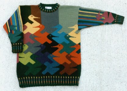 An intriguing eye-catching design of identical interlocking ducks, inspired by the works of the graphic artist and mathematician, M.C. Escher. A great use for many colors of one weight of yarn.